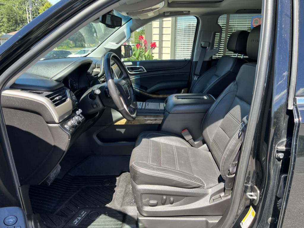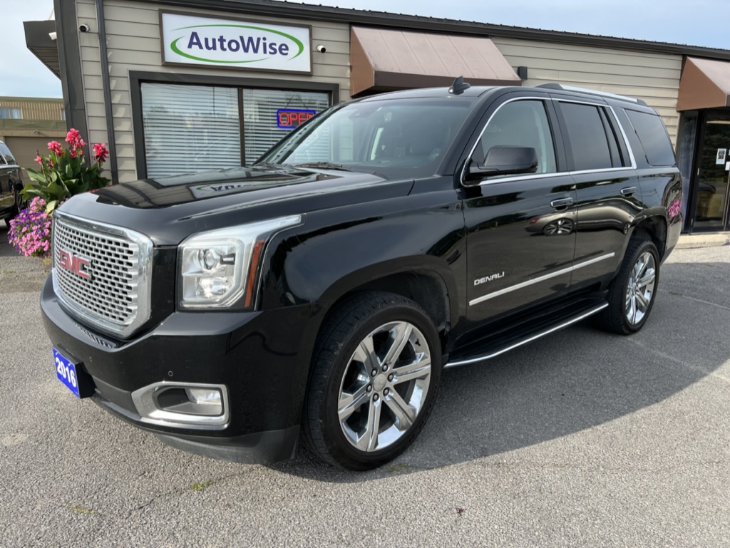 2016 GMC Yukon Denali 4×4 with 6.2 litre engine, automatic transmission, remote start, keyless entry, leather, automatic climate controls, power heated and cooled front seats with driver side memory, middle row heated seats, Bluetooth, navigation, power tilt and telescopic steering, cruise control, power heated and folding mirrors, tinted windows, power rear hatch, tow package, only 108,000 km and a clean CarFax!