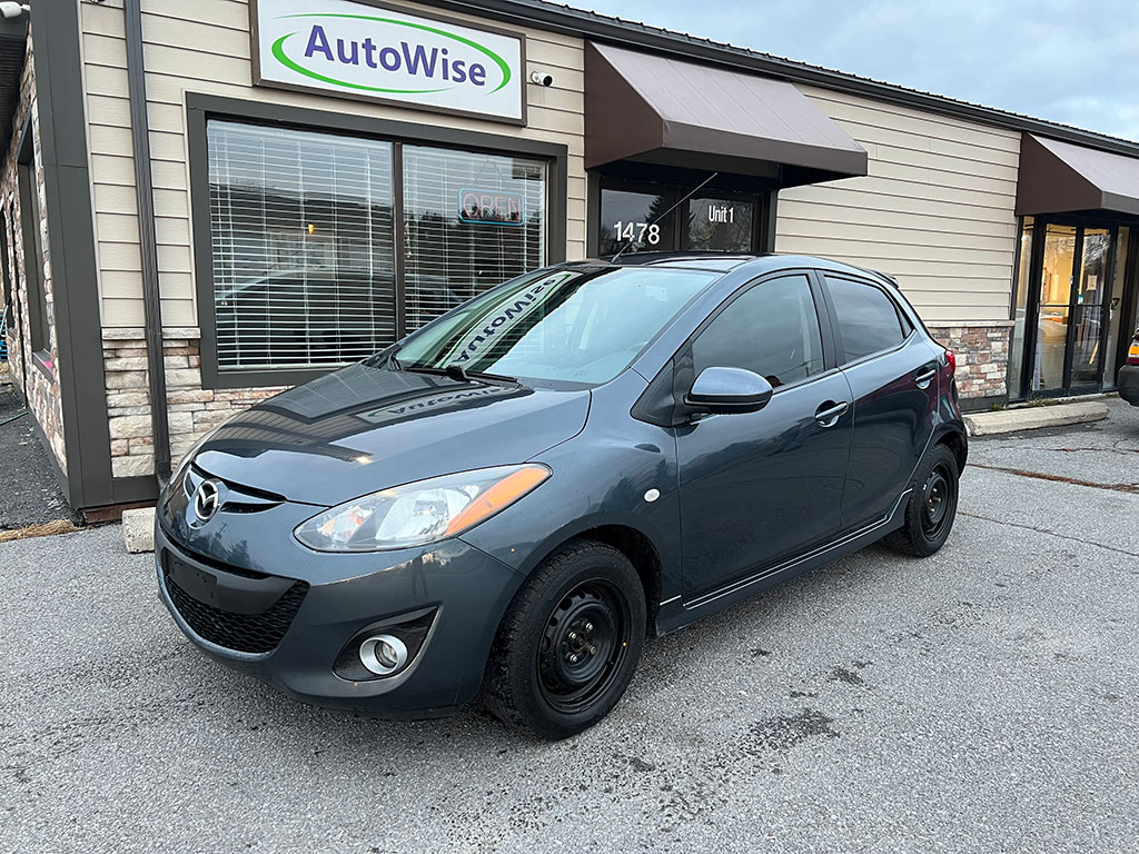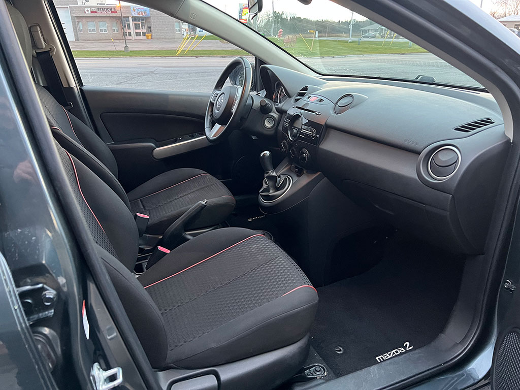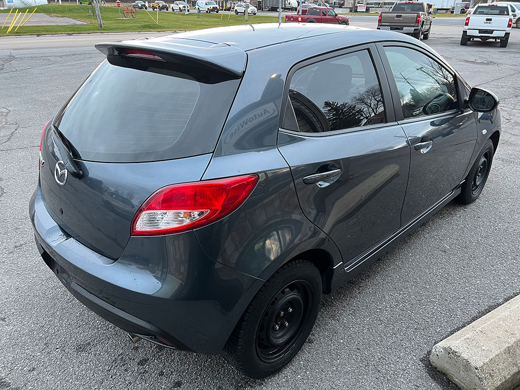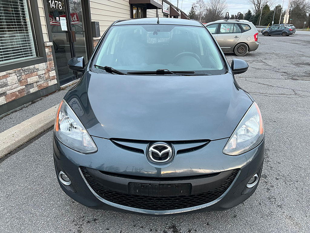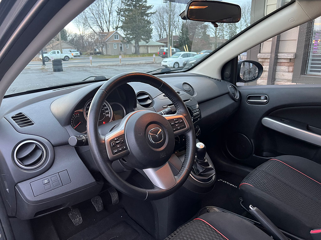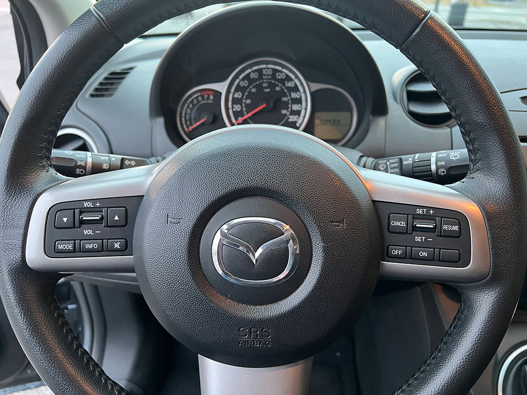 2011 Mazda Mazda2 with 1.5 litre engine, manual transmission, automatic headlights, air conditioning, tilt steering, cruise control, power windows, power locks, power mirrors, alloy wheels, steel wheels with winter tires, only 90,400 km and a clean CarFax!