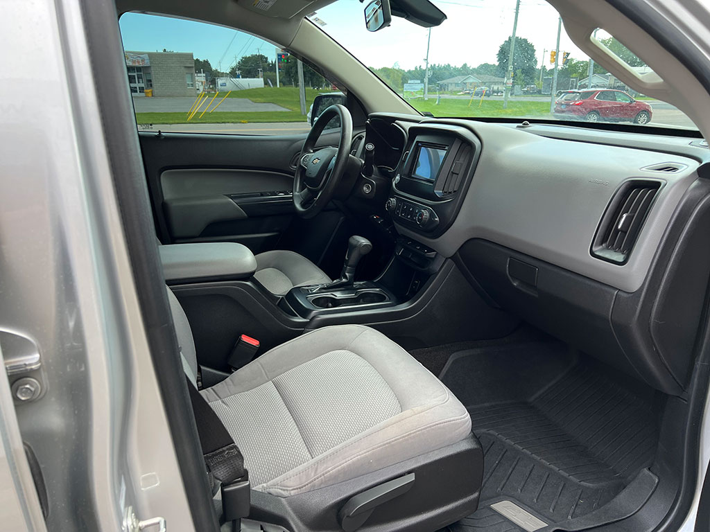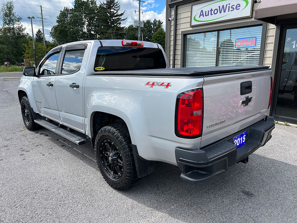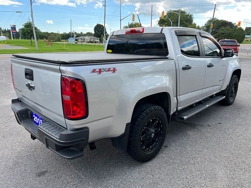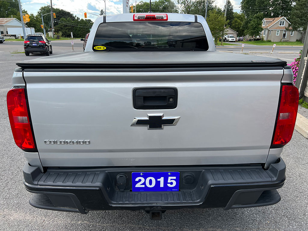 • 2015 Chevrolet Colorado WT 4×4 with 3.6 litre engine, automatic transmission, keyless entry, remote start, rear view camera, tilt steering, cruise control, automatic headlights, trailer brake controller, soft tonneau cover, Line-X spray-on bedliner, alloy wheels, 154,400 km and a clean CarFax!